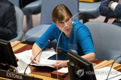 epa09483337 Kersti Kaljulaid, President of Estonia, speaks during a meeting of the United Nations Security Council during the 76th Session of the U.N. General Assembly in New York City, New York, USA, 23 September 2021. EPA/JOHN MINCHILLO / POOL