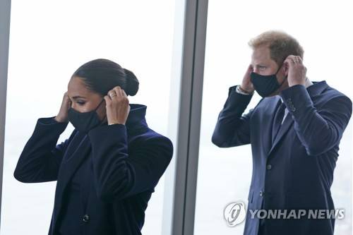 Meghan Markle and Prince Harry put their masks back on after a photograph at the observatory in One World Trade in New York, Thursday, Sept. 23, 2021. (AP Photo/Seth Wenig)