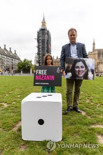 epa09483358 Daughter Gabriella Ratcliffe (L) and husband Richard Ratcliffe (R) hold banners in support of aid worker Nazanin Zaghari-Ratcliffe who is detained in Iran, in Parliament Square in London in London, Britain, 23 September 2021. The day marks the 2000th day of Nazanin Zaghari-Ratcliffe's detention in Iran. EPA/VICKIE FLORES