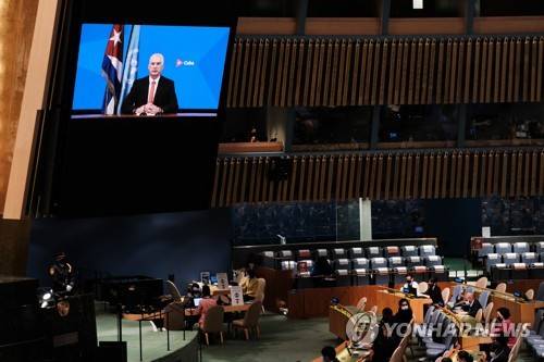 epa09483364 Cuban President Miguel Diaz-Canel speaks via video link at the 76th session of the United Nations General Assembly at UN Headquarters in New York City, New York, USA, 23 September 2021. EPA/SPENCER PLATT / POOL