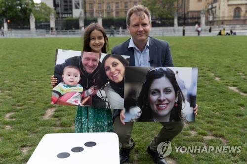 epa09483362 Daughter Gabriella Ratcliffe (L) and husband Richard Ratcliffe (R) hold photographs in support of aid worker Nazanin Zaghari-Ratcliffe who is detained in Iran, at Parliament Square in London in London, Britain, 23 September 2021. The day marks the 2000th day of Nazanin Zaghari-Ratcliffe's detention in Iran. EPA/VICKIE FLORES