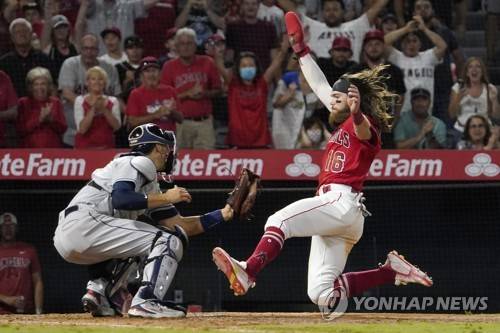 Los Angeles Angels' Brandon Marsh, right, scores on a three RBI double by Jack Mayfield as Houston Astros catcher Jason Castro kneels at the plate during the seventh inning of a baseball game Wednesday, Sept. 22, 2021, in Anaheim, Calif. (AP Photo/Mark J. Terrill)