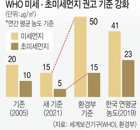 국내 미세먼지 기준 변화도 이뤄질 전망이다. 이 관계자는 "국내 초미세먼지 기준이 2018년 25㎍/㎥에서 현재 15㎍/㎥까지 낮아진 상태지만 WHO에서 권고하는 수준만큼 지속적으로 강화해 나갈 계획"이라며 "대기질 개선은 온실가스 감축에도 영향을 준다는 점도 함께 고려해 관련 정책을 보완하겠다"고 말했다.