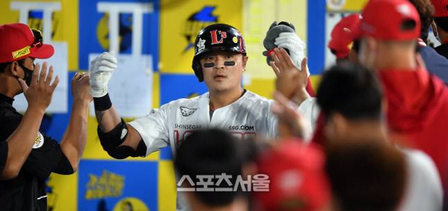 SSG 1번 추신수가 23일 2021프로야구 SSG랜더스와 롯데자이언트의 경기 4회말 무사 1,2루에서 박세웅을 상대로 역전 3점 우중월홈런을 터트린후 홈인하고 있다. 추신수는 1회말 선두타자로 나와 솔로홈런을 기록했었다. 시즌 18호 홈런을 기록하며 20-20에 바짝 다가섰다.2021.09.23.