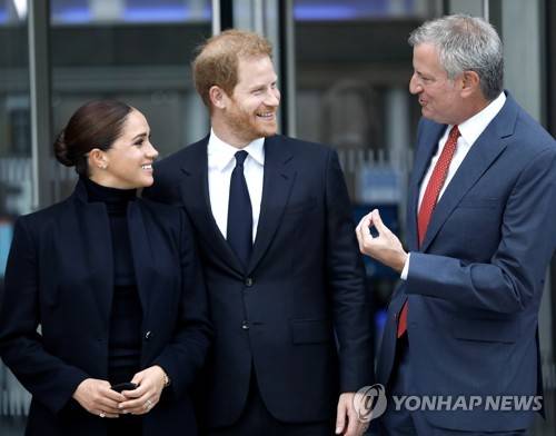 epa09483657 Britain's Prince Harry, Duke of Sussex (C) and his wife Meghan, Duchess of Sussex (L) and New York City Mayor Bill de Blasio speak in front of the World Tase Center in New York, New York, USA, 23 September 2021. The couple will attend the Global Citizen Concert in Central Park to stress the importance of global vaccine equity to end the coronavirus disease (COVID-19) pandemic. EPA/PETER FOLEY