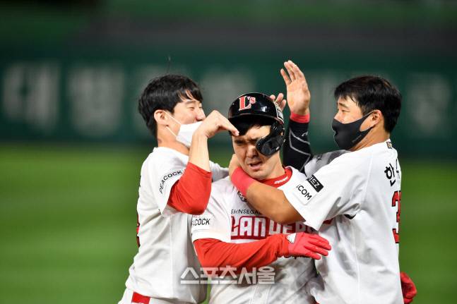 SSG 8번 이재원이 23일 2021프로야구 SSG랜더스와 롯데자이언트의 경기 9회말 2사 3루에서 롯데 마무리 김원중을 상대로 끝내기 내야안타를 기록한 후 동료들의 축하를 받고 있다. 2021.09.23.