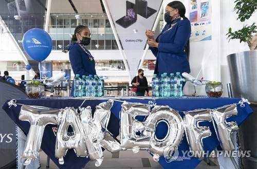 epa09483795 South African Airways ground crew operate a special welcome desk at check in after South African Airways resumed flights following bankruptcy at Cape Town International airport, South Africa, 23 September 2021. South African Airways flew its first flights since March 2020 following a series of bankruptcy proceedings. The South African government bailed out the airline with more than 426 million euros and a restructuring of its debt as the airline emerged from bankruptcy after slashing hundreds of jobs and selling a fifty one percent share of its business to a group of investors called the Takatso Consortium. EPA/NIC BOTHMA