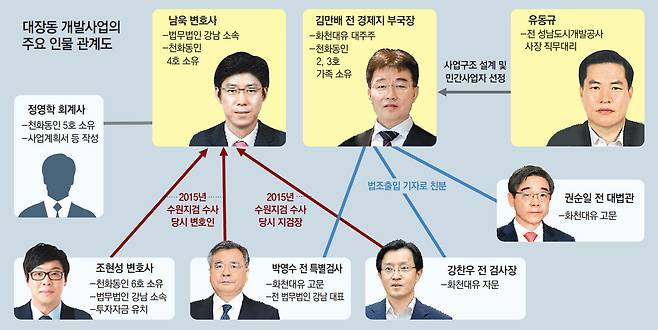 경기 성남시 분당구 대장동 개발사업 특혜 의혹에 전직 고위 판검사 출신의 법조인들이 다수 연루돼 있는 배경에는 화천대유자산관리(화천대유)의 대주주 김만배 씨와 화천대유의 관계사 천화동인 4호의 소유주인 남욱 변호사의 인맥이 작용했다는 분석이 나온다.