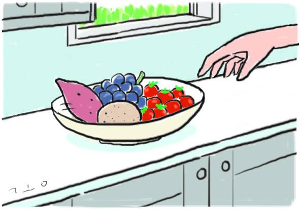 우리 집 싱크대 상판에는 늘 먹을거리가 놓여 있는 편이다. 거봉이나 방울토마토. 다른 과일의 경우 한 입 크기로 잘라 놓는다. 요리하고 남은 당근이나 오이를 두기도 한다. 그 밖에 초콜릿이나 견과류, 감자, 고구마, 누룽지, 생라면, 젤리 등등. 아무튼 집안을 오가며 손으로 주워 먹기 좋은 음식거리를 늘 두려고 한다.