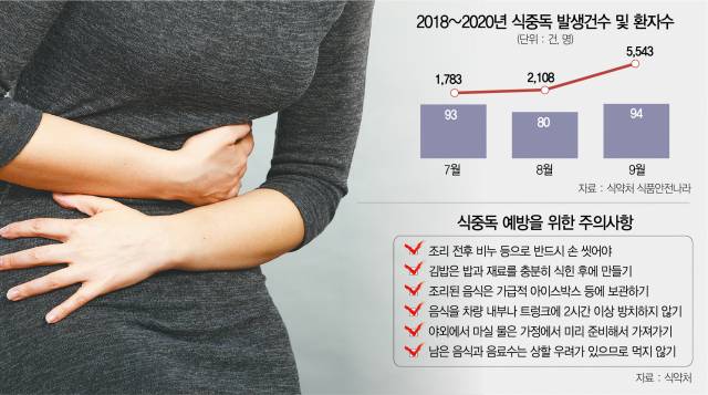 식품의약품안전처 식품안전나라 통계에 따르면 지난 2018년부터 지난해까지 3년간 9월 총 식중독 발생 건수는 94건(환자수 5,543명)이다. 같은 기간 7월 93건(환자수 1,783명), 8월 80건(환자수 2,108명)을 웃도는 수준이다. 물론 이런 수치가 나온 데는 2018년 9월 무려 56건(환자수 5,239명)이나 발생한 탓이 크다. 그럼에도 불구하고 매년 9월 식중독 발생 건수는 무시할 수준이 아니다. 주된 요인은 방심이라는 게 중론. 여름에는 ‘더운 곳에 오래 뒀으니 먹지 말아야지’라고 생각하는 반면 가을에는 ‘날씨가 선선하니 먹어도 될거야’라고 생각한다는 것이다.