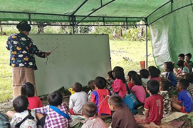 | ▲ 미얀마 쿠데타 세력의 탄압으로 인해 수많은 난민이 발생하고 있는 가운데, 미얀마 사진기자 모임인 MPA(Myanmar Pressphoto Agency)가 카야(Kayah)주 난민촌에 마련된 임시 학교의 6월 17일 모습을 사진에 담아 보내왔다. |