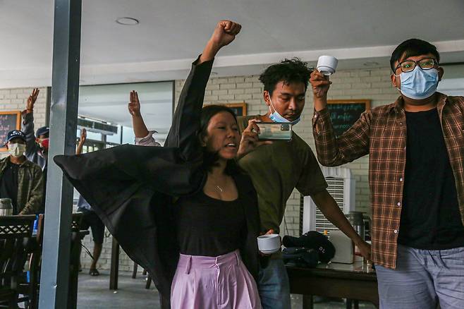 | ▲ 만달레이 대학생연합이 5월 19일 한 카페에서 군부 쿠데타에 저항하는 시위를 벌이고 있다. |