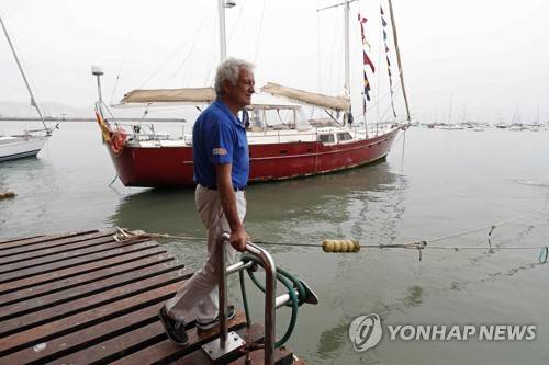 epa09484484 Pepe Sola, the captain of the sailboat Pros, prepares to set sail at the port of Callao, Peru, 23 September 2021. After an interruption of a year and a half forced by the covid-19 pandemic, the recreation of the first circumnavigation resumed by the Pros sailboat with the complicated but not impossible goal of arriving in September 2022 in Seville (Spain), its point of origin. With three-quarters of its route still to be traveled, the 23-meter-long vessel was about to set sail for Guayaquil (Ecuador) from the Lima port of Callao (Peru), where the ship has remained since March 2020. EPA/Paolo Aguilar