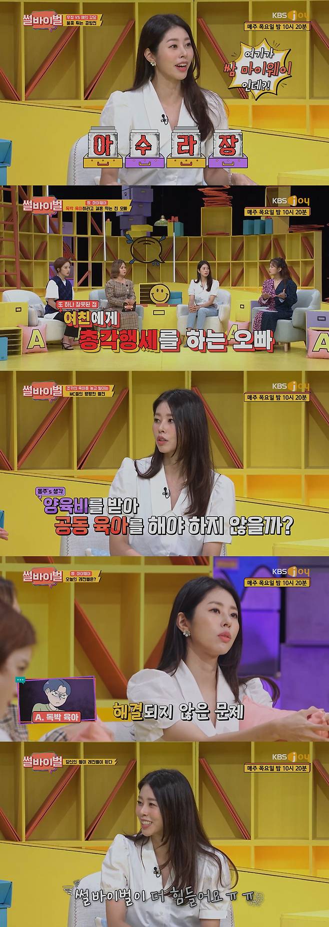 지난 23일 방송된 KBS Joy 예능 프로그램 '썰바이벌'에는 변호사 겸 방송인 서동주가 출연한 가운데 '독박 육아'가 레전 썰로 선정됐다.