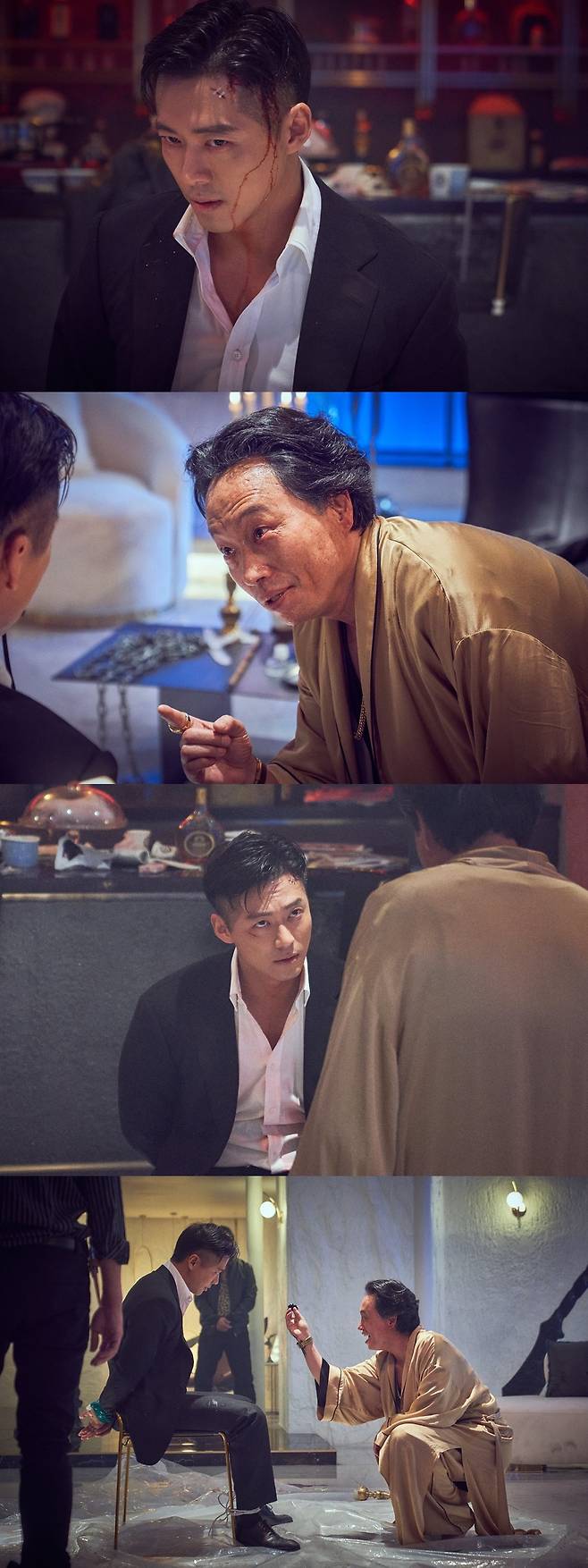 한 치 앞을 예상할 수 없는 전개가 펼쳐진 가운데, 24일 공개된 스틸 속 한지혁의 모습이 눈길을 끈다. 화려한 인테리어와 고급 가구들이 즐비한 펜트하우스에서 재갈을 물고 맨발로 결박된 채 황모술을 노려보는 한지혁의 표정은 이들 사이에 심상치 않은 일이 벌어졌음을 암시하며 극적 긴장감까지 자아내고 있다.