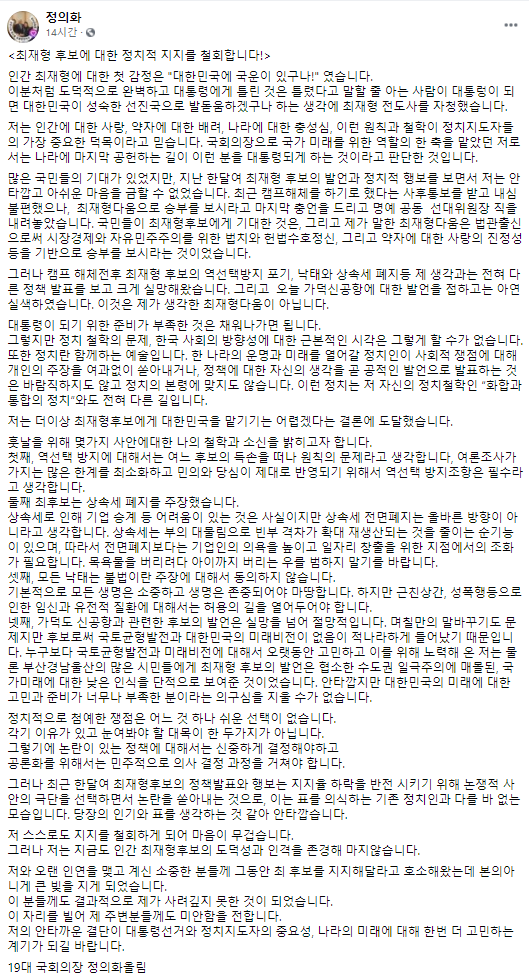 정 의장은 “저 스스로도 지지를 철회하게 되어 마음이 무겁다”면서 “저와 오랜 인연을 맺고 계신 소중한 분들께 그동안 최 전 원장을 지지해달라고 호소해왔는데 본의 아니게 큰 빚을 지게 되었다”고 전했다.