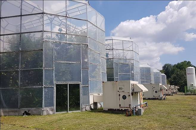 □ 기존에는 상부 개방형온실(OTC, Open Top Chamber)을 이용하여 대기 중 이산화탄소 농도 증가와 온도 상승에 따른 수목의 생육 특성 구명을 위한 연구를 수행해 왔다.