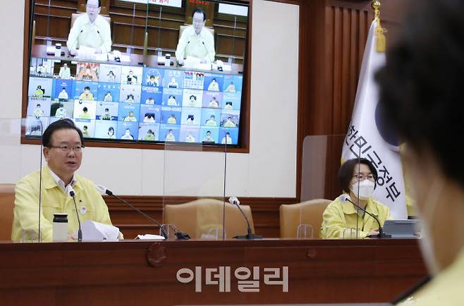 [이데일리 김태형 기자] 김부겸 국무총리가 24일 오전 서울 종로구 정부서울청사에서 열린 코로나19 중앙재난안전대책본부(중대본) 회의에 참석해 발언하고 있다.
