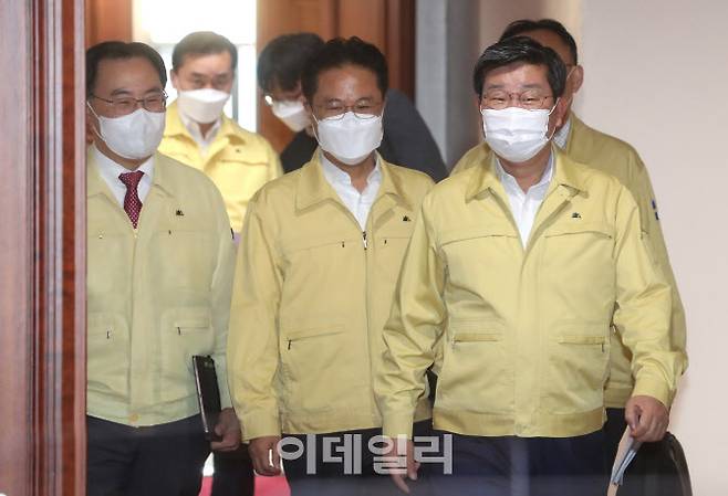 [이데일리 김태형 기자] 전해철(오른쪽부터) 행정안전부 장관, 김정우 조달청장, 문승욱 산업통상자원부 장관 등이 24일 오전 서울 종로구 정부서울청사에서 열린 코로나19 중앙재난안전대책본부(중대본) 회의에 참석하고 있다.