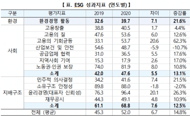 지난해 기준 분야별 점수는 지배구조(G)가 68.8점으로 가장 높았고 사회(S) 47.6점, 환경(E) 39.7점으로 조사됐다. 환경 분야는 점수가 상대적으로 낮았지만 2019년 대비 증감률은 다른 분야보다 높았다.