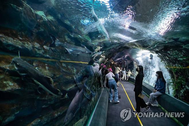 (서울=연합뉴스) 지난 23일 서울 송파구 롯데월드 아쿠아리움을 찾은 손님들이 오션터널에서 해양생물들을 바라보고 있다. 2021.9.24