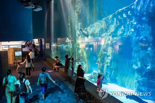 (서울=연합뉴스) 지난 23일 서울 송파구 롯데월드 아쿠아리움을 찾은 손님들이 메인 수조 '디오션'에서 해양생물들을 바라보고 있다. 2021.9.24