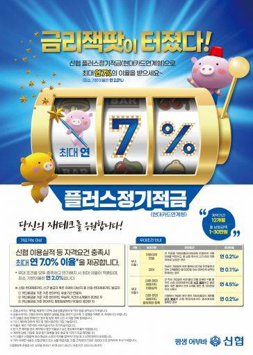 신협중앙회가 연 최고 7% 금리를 제공하는 '플러스정기적금'을 새로 출시했다.