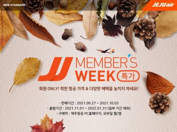 제주항공이 이달 27일부터 10월 3일까지 회원 대상 항공권 할인 이벤트인 'JJ멤버스 특가'를 진행한다고 24일 밝혔다.