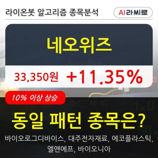 이 시각 거래소에서 네오위즈 이외에도 바이오로그디바이스(10.67%), 대주전자재료(18.33%), 에코플라스틱(10.1%), 엘앤에프(18.98%), 바이오니아(10.0%) 등이 상승세를 보이고 있다.