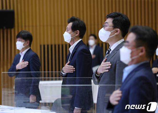 (서울=뉴스1) 신웅수 기자 = 오세훈 서울시장이 24일 오전 서울시청에서 열린 2021년 하반기 폭력 예방 통합 교육에서 국민의례를 하고 있다.