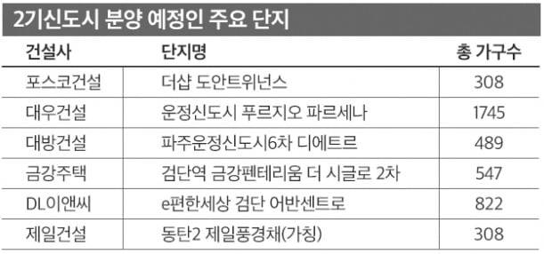 이달중에는 포스코거설이 대전 도안신도시에 ‘더샵 도안트위넌스’를 분양한다. 전용 84㎡ 총 308실이다. 다음달엔 운정신도시 A13블록에 ‘운정신도시 푸르지오 파르세나’(1745가구)가, 인천 검단신도시 RC4블록에서는 금강주택이 ‘검단역 금강펜테리움 더 시글로 2차’ 아파트(483가구)와 오피스텔(64실)을 예정하고 있다. 이 밖에 DL이앤씨가 AA6블록에서 ‘e편한세상 검단 어반센트로’(822가구)를, 제일건설은 동탄2신도시 A60블록에 308가구를 분양할 예정이다.