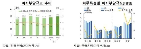 또 차주 1인당 연간 이자부담규모는 2020년 271만원에서 금리인상 폭에 따라 각각 286만원(0.25%p 인상시) 및 301만원(0.50%p 인상시)으로 증가했다. 소득수준별로는 소득 상위 30%인 고소득자가 기존 381만원에서 424만원으로(0.50%p 인상시) 이자부담 증가폭이 컸다. 취약여부별로는 취약차주가 320만원에서 373만원으로 1인당 이자부담 증가폭이 컸다.