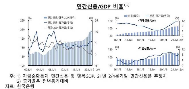 한편 명목 GDP 대비 가계, 기업의 빚 등을 합한 민간신용 비율은 217.1%로 추정됐다. 1년 전보다 11.2%포인트 상승했다. 명목 GDP가 3.6% 늘어났음에도 민간신용 증가율이 9.2%로 높은 영향이다.
