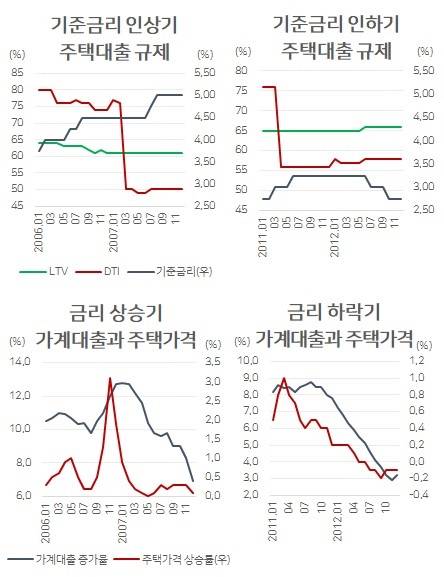 실제 지난 2006~2007년과 2011~2012년 등 LTV·DTI 완화와 기준금리 인상이 함께 진행됐던 시기에 대출 증가율과 주택가격 상승률이 유의미하게 둔화됐다. 반대로 LTV·DTI 상향에 기준금리 인하가 동반됐던 2008~2009년, 2014~2015년 당시엔 대출·집값이 두드러진 오름세를 보였다.
