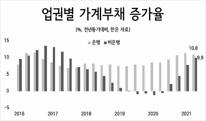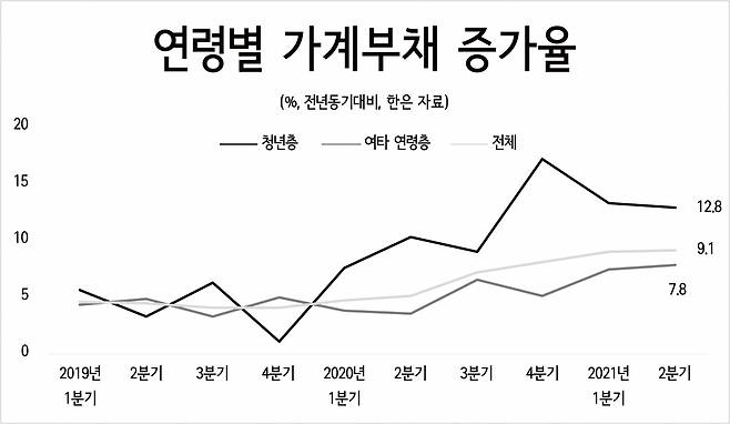 ▶고위험 비은행 주고객 된 청년들…은행 증가율 넘어=이런 가운데 청년층(2030)의 부채 증가 속도에 빨간불이 켜졌다. 한은에 따르면 청년층이 전체 가계부채에서 차지하는 비중은 작년말 27.0%로 역대 가장 높은 수준을 기록했고 올 2분기 현재 26.9%로 비슷한 수준이 유지되고 있다. 특히 부채 증가율(전년동기대비)은 12.8%로 작년 4분기(17.1%), 올 1분기(13.3%)에 이어 세 분기 연속 두 자릿수를 나타냈다.