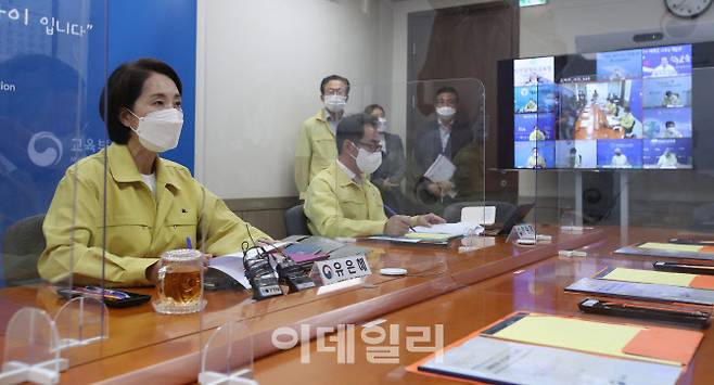 [이데일리 김태형 기자] 유은혜 사회부총리 겸 교육부 장관이 24일 서울 종로구 정부서울청사에서 열린 '교육부장관-시도교육감 간담회'에 참석해 모두발언을 하고 있다.