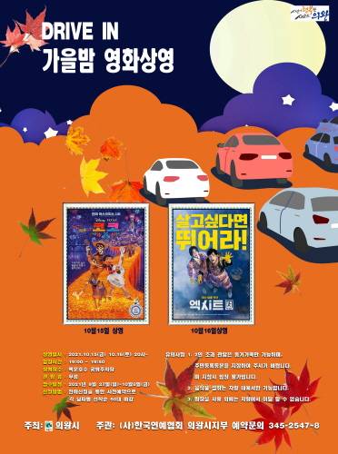 경기 의왕시가 10월 15일과 16일 이틀간 '드라이브-인 가을밤 영화상영'을 오후 8시부터 백운호수 공영주차장에서 운영한다.