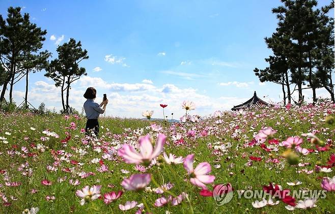 (서산=연합뉴스) 화창한 가을 날씨를 보인 24일 충남 서산시 양대동 천수만 간척지 A지구 농로를 찾은 한 시민이 활짝 핀 코스모스를 카메라에 담고 있다. 2021.9.24 [서산시 제공. 재판매 및 DB 금지]