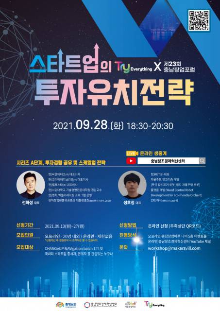 10개국 글로벌 창업 생태계 전문가, 500여 개 사의 스타트업이 참여하는 글로벌 스타트업 대축제 ‘트라이 에브리싱 2021’(Try Everything 2021년 9월 15일~17일)과 공동으로 진행하는 이번 포럼은 코로나19 확산 방지를 위해 충남 창업나비마루에서 소규모 오프라인으로 진행된다.