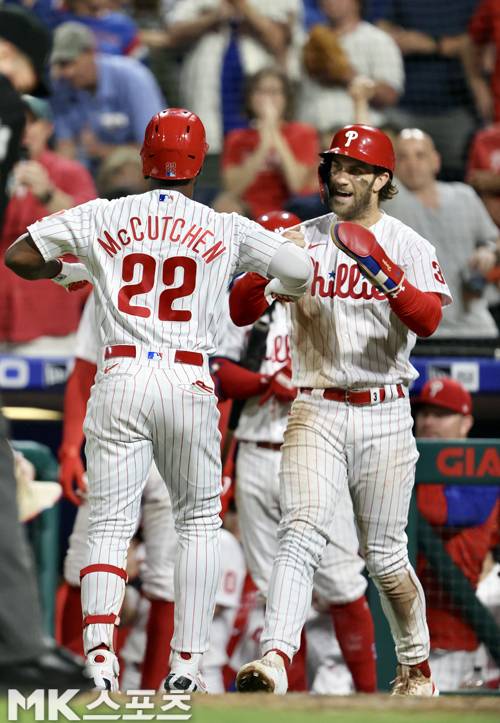 6회말 필라델피아 공격에서 앤드류 맥커친의 홈런으로 득점한 브라이스 하퍼가 맥커친을 반기고 있다.