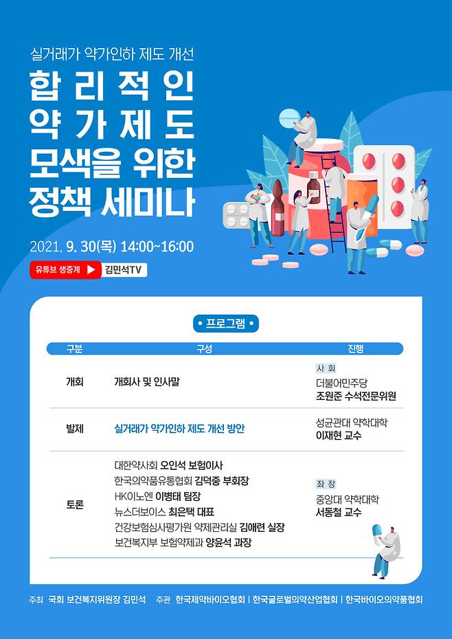 한국제약바이오협회는 김민석 국회 보건복지위원회 위원장이 주최하고 협회와 한국글로벌의약산업협회, 한국바이오의약품협회가 공동 주관하는 '합리적인 약가제도 모색을 위한 정책 세미나'를 오는 30일 오후 2시에 진행한다고 24일 밝혔다.