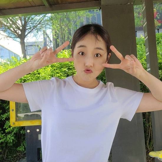 공개된 사진 속 박보미는 흰색 반팔티를 입고 양손으로 브이를 그리는 모습.