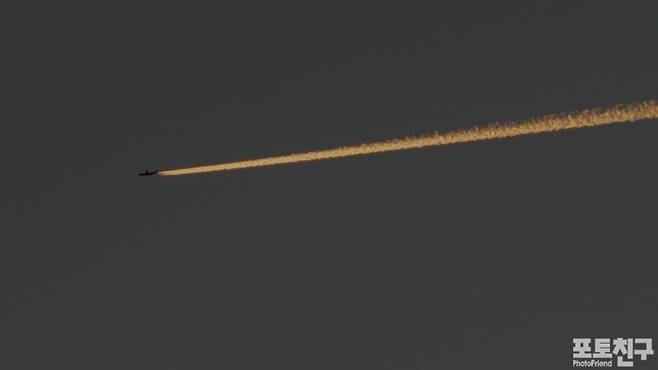 어두운 하늘 아침햇살에 빛나는 비행운이 아련하고