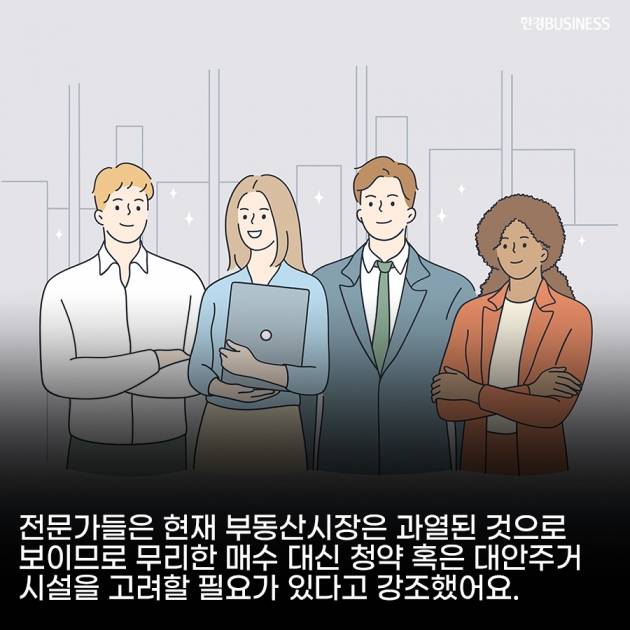전문가들은 현재 부동산시장은 과열된 것으로 보이므로 무리한 매수 대신 청약 혹은 대안주거 시설을 고려할 필요가 있다고 강조했어요.