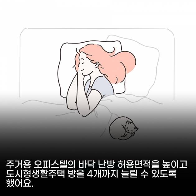 주거용 오피스텔의 바닥 난방 허용면적을 높이고 도시형생활주택을 방을 4개까지 늘릴 수 있도록 했어요.