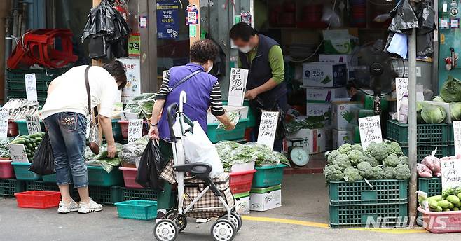 24일 오후 서울 마포구 망원동월드컵시장에서 시민들이 농산물을 구매하고 있다.