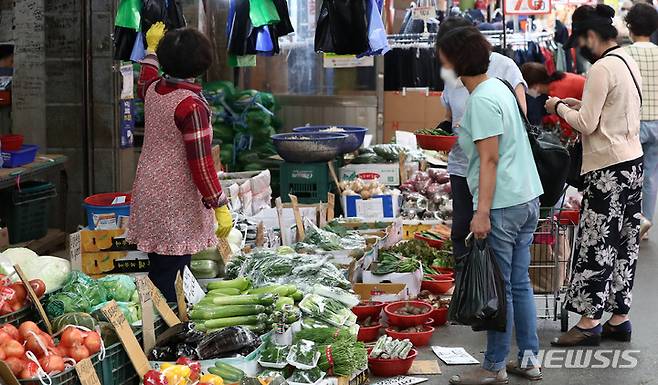 [서울=뉴시스] 이영환 기자 = 24일 오후 서울 마포구 망원시장에서 시민들이 농산물을 구매하고 있다. 이날 한국은행이 발표한 2021년 8월 생산자물가 지수는 전월대비 0.4% 오른 110.72로 1965년 1월 통계 작성이래 역대 최고치를 기록했으며 지난해 11월 부터 10개월 연속 상승세를 보이고 있다. 또한 시금치(86.2%), 배추(47.2%) 등 농산물이 2.1% 오르며 전체 농림수산품이 전월대비 0.7% 올랐다. 2021.09.24. 20hwan@newsis.com