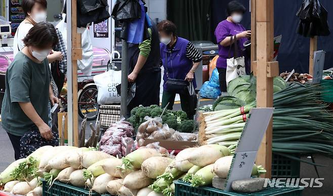 [서울=뉴시스] 이영환 기자 = 24일 오후 서울 마포구 망원동월드컵시장에서 시민들이 농산물을 구매하고 있다. 이날 한국은행이 발표한 2021년 8월 생산자물가 지수는 전월대비 0.4% 오른 110.72로 1965년 1월 통계 작성이래 역대 최고치를 기록했으며 지난해 11월 부터 10개월 연속 상승세를 보이고 있다. 또한 시금치(86.2%), 배추(47.2%) 등 농산물이 2.1% 오르며 전체 농림수산품이 전월대비 0.7% 올랐다. 2021.09.24. 20hwan@newsis.com