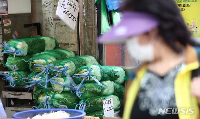 24일 오후 서울 마포구 망원시장에서 배추가 판매되고 있다.