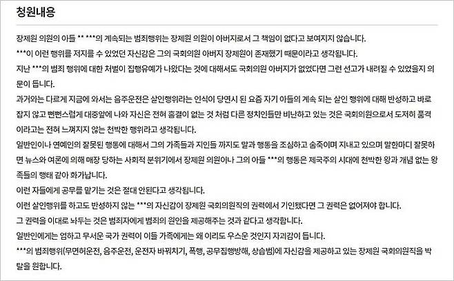 지난 23일 청와대 국민청원 게시판에는 '*** 아버지 장제원 국회의원직 박탈을 원합니다'라는 제목의 글이 올라왔습니다.